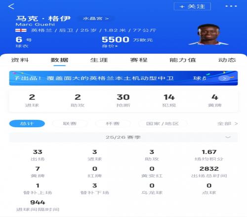 格伊现年25岁,司职中卫,他本赛季为水晶宫出场33次,贡献3球4助,他与水晶宫的合同在赛季末到期,现身价5500万欧。